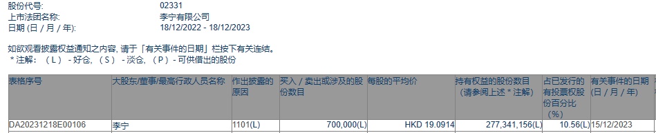 智通财经APP获悉,香港联交所最新资料显示,12月15日,执行主席兼联席行政总裁李宁增持李宁(02331)70万股,每股作价为19.0914港元;总金额约为1336.40万港元。增持后最新持股数目约为2.77亿股,最新持股比例为10.56%。