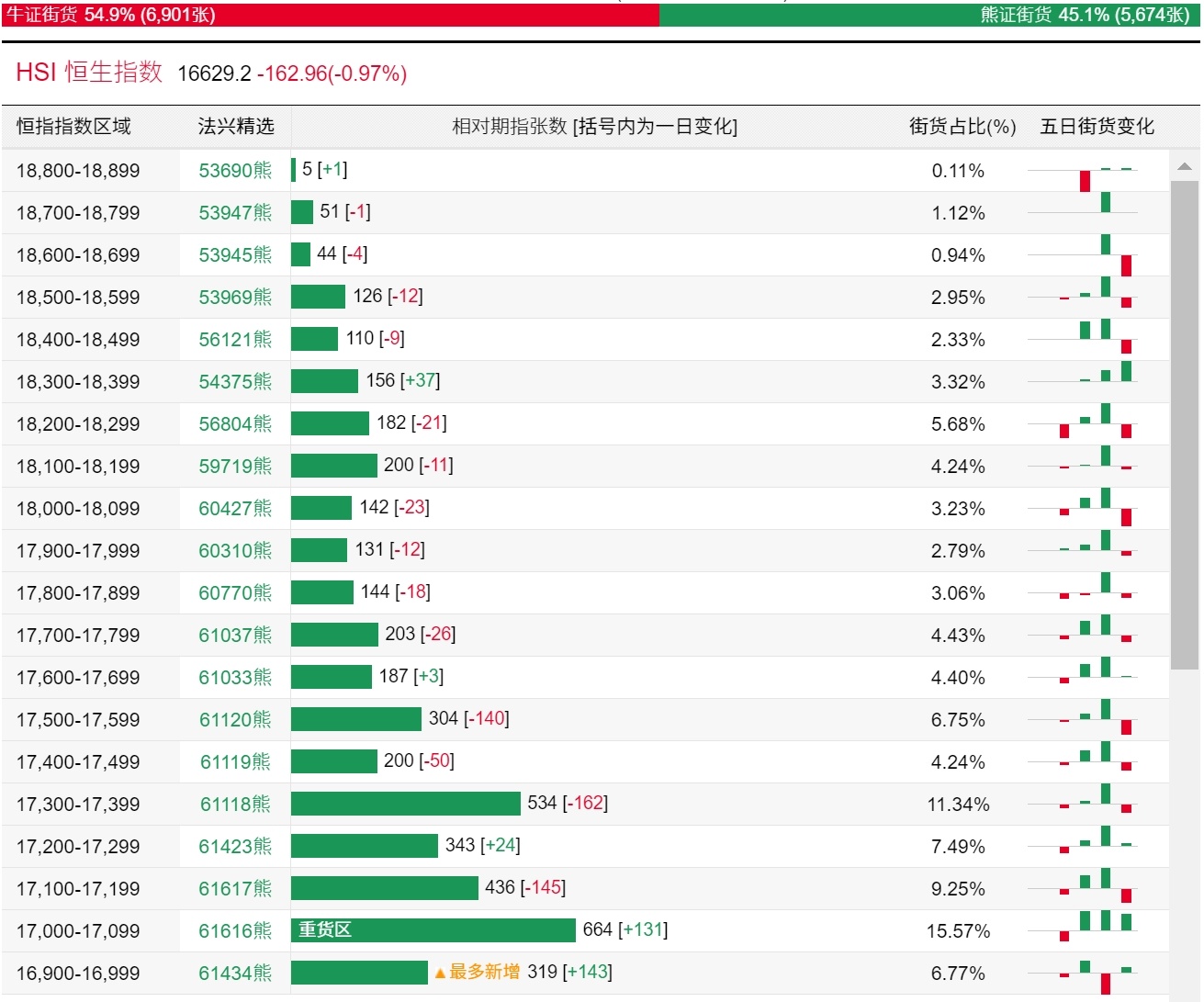 法兴恒指牛熊证街货分布图中的数据显示,熊证街货重货区在17000-17099区间,该区间最新熊证数量为664张,较上一交易日增加131张;最多新增在16900-16999区间,该区间最新熊证数量为319张,较上一交易日增加143张。