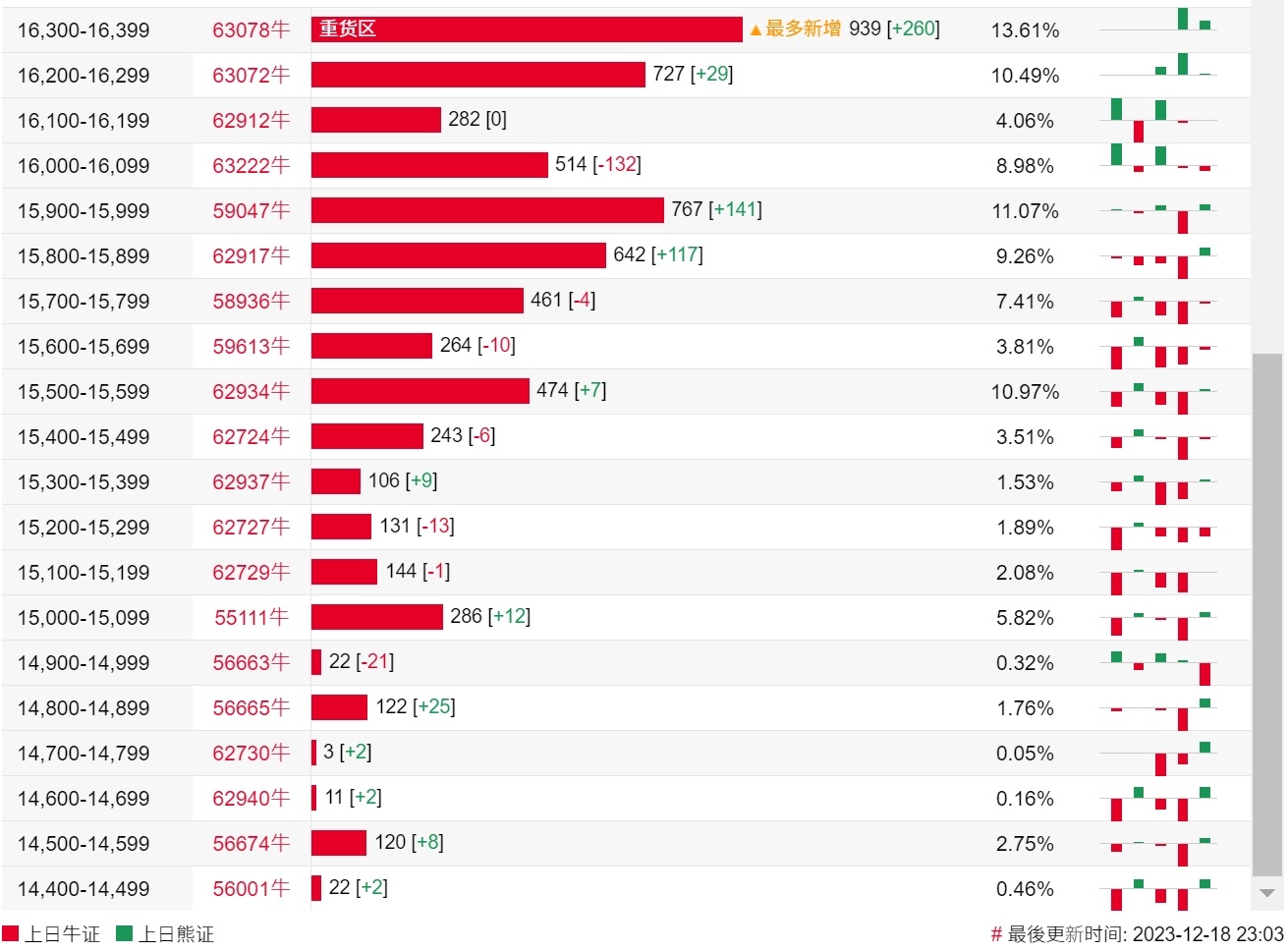 牛证街货重货区和最多新增都在16300-16399区间,该区间最新牛证数量为939张,较上一交易日增加260张。