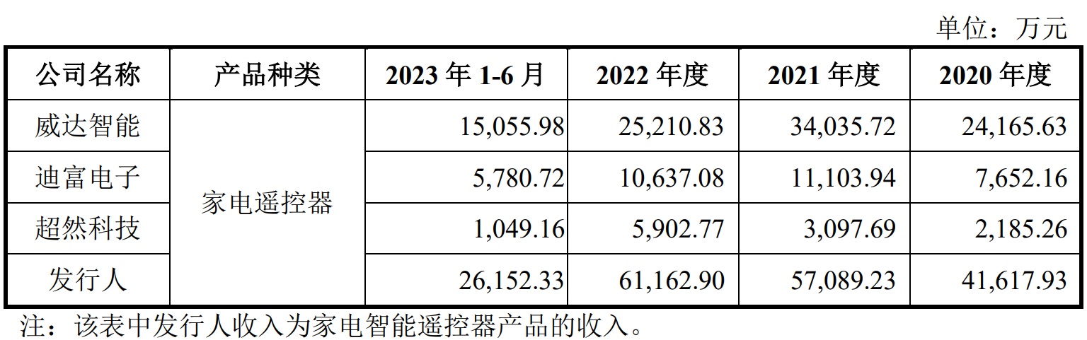 国内主要生产智能遥控器产品的公众公司为威达智能、迪富电子和超然科技。由于缺乏权威机构对智能遥控器行业内各主要厂商的市场份额统计,因此,通过比较国内可比公司销售收入衡量公司国内行业地位。公司与威达智能、迪富电子和超然科技智能遥控器产品销售收入的对比情况如下表所示: