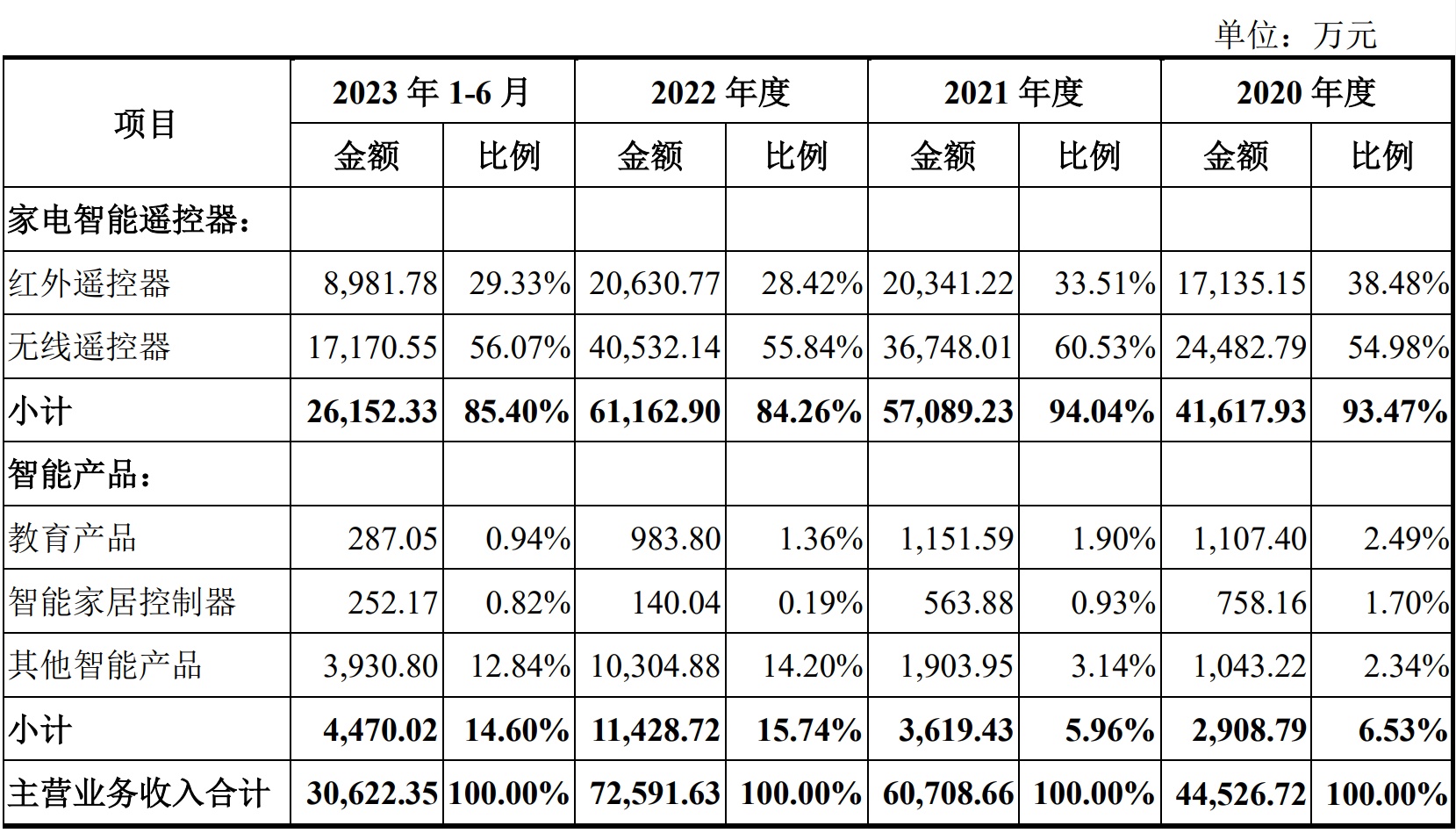 据招股书,辰奕智能主要从事智能遥控器和智能产品的设计、研发、生产及销售,为国内外客户提供产品原型设计、电子电路设计、嵌入式软件和硬件开发集成为一体的智能遥控器综合解决方案,产品主要应用于家电及智能家居行业。自公司成立以来,主营业务未发生变化。
