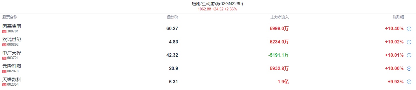 短剧概念股继续活跃,中广天择再度涨停,股价创历史新高,欢瑞世纪封板,因赛集团、引力传媒、海看股份、中文在线等纷纷跟涨。