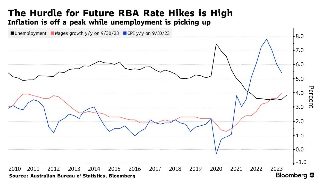 会议纪要显示,澳洲联储将基准利率维持在4.35%的12年高点,以观察经济和通胀数据。委员们指出,失业率可能会比预期的上升幅度更大——目前为3.9%,仍处于较低水平——家庭的财务状况已经受到“痛苦的挤压”。
