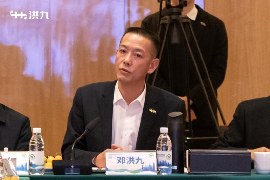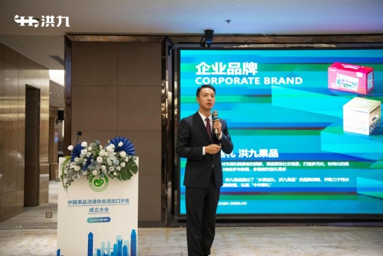 洪九果品首席运营官邓浩吉向参会嘉宾介绍企业品牌、数智化供应链及发展战略