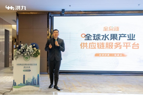洪九果品“全果链”负责人李峻熊对洪九果品打造的全球水果产业供应链服务平台进行介绍展示