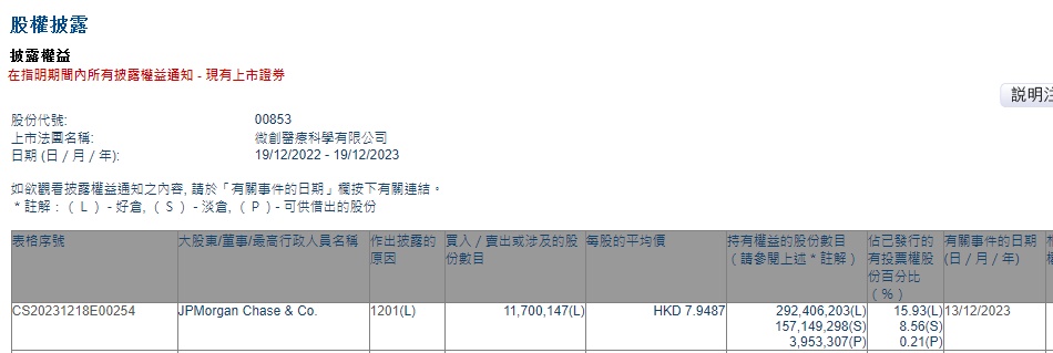 智通财经APP获悉,香港联交所最新资料显示,12月13日,小摩减持微创医疗(00853)1170.0147万股,每股作价7.9487港元,总金额约为9300.10万港元。减持后最新持股数目约为2.92亿股,最新持股比例为15.93%。