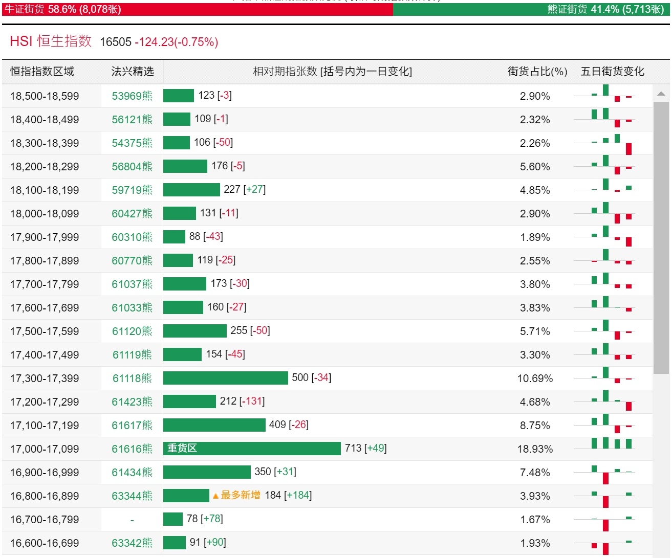 法兴恒指牛熊证街货分布图中的数据显示,熊证街货重货区在17000-17099区间,该区间最新熊证数量为713张,较上一交易日增加49张;最多新增在16800-16899区间,该区间最新熊证数量为184张,较上一交易日增加184张。