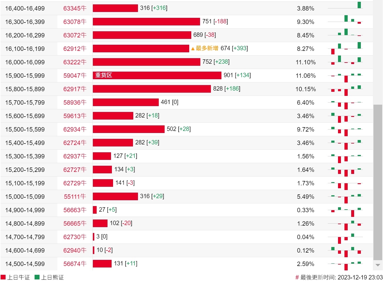 牛证街货重货区在15900-15999区间,该区间最新牛证数量为901张,较上一交易日增加134张;最多新增在16100-16199区间,该区间最新牛证数量为674张,较上一交易日增加393张。