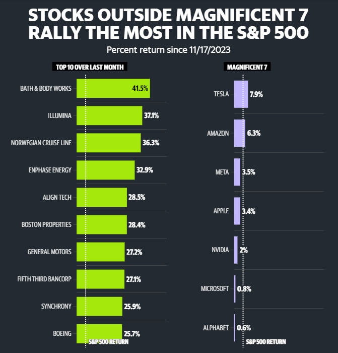 与此同时,过去一个月,科技股七巨头的涨幅都没有超过8%。特斯拉在这段时间里上涨了约7.9%,在“七巨头”中名列前茅,但自11月17日以来,在标准普尔500指数的个股涨幅中,特斯拉勉强排在上半部分。