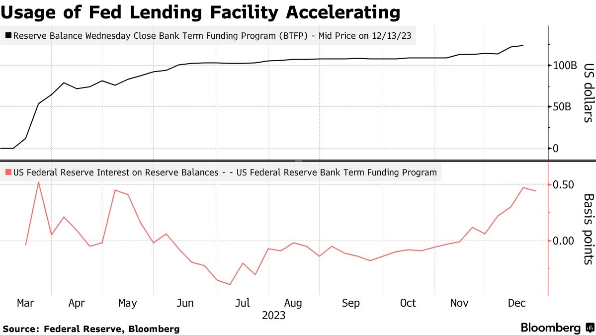 同时,BTFP借款成本的下降意味着银行可以利用更大的套利空间,即机构从该设施借款,然后将所得款项存放在美联储的账户中,以赚取准备金余额利息——目前为5.40%。这一利差目前为44个基点,12月14日曾跳升至51个基点。