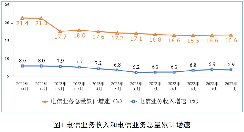 电信业务量收实现平稳增长。1—11月份,电信业务收入累计完成15548亿元,同比增长6.9%,按照上年不变价计算的电信业务总量同比增长16.6%,量收增速均与1—10月份持平。