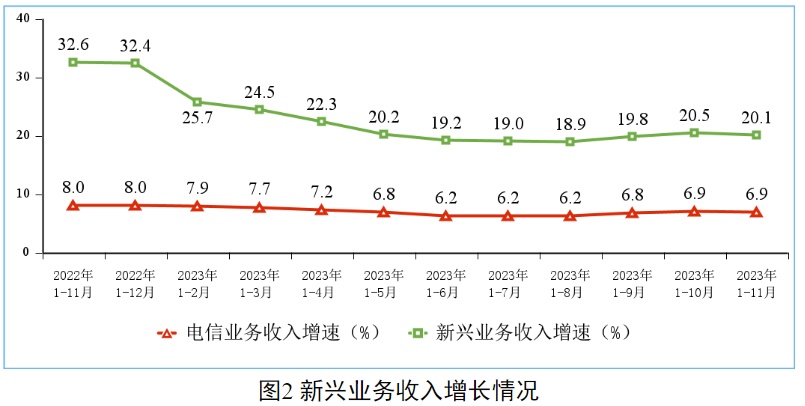 新兴业务收入维持较高增势。三家基础电信企业积极发展IPTV(网络电视)、互联网数据中心、大数据、云计算、物联网等新兴业务,1—11月份共完成业务收入3326亿元,同比增长20.1%,在电信业务收入中占比为21.4%,拉动电信业务收入增长3.8个百分点。其中云计算和大数据收入同比增速分别达39.7%和43.3%,物联网业务收入同比增长22.7%。
