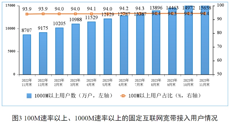 固定宽带千兆接入用户占比已近四分之一。截至11月末,三家基础电信企业的固定互联网宽带接入用户总数达6.36亿户,比上年末净增4621万户。其中,100Mbps及以上接入速率的固定互联网宽带接入用户达6亿户,占总用户数的94.4%,占比较上年末提升0.5个百分点;1000Mbps及以上接入速率的固定互联网宽带接入用户达1.57亿户,比上年末净增6483万户,占总用户数的24.6%。