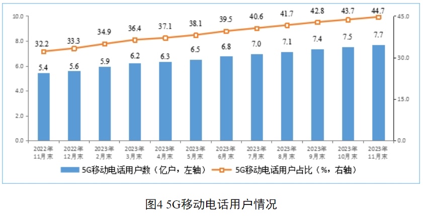 移动电话用户数稳中有增,5G用户规模加速扩大。截至11月末,三家基础电信企业的移动电话用户总数达17.26亿户,比上年末净增4269万户。其中,5G移动电话用户达7.71亿户,比上年末净增21040万户;占移动电话用户的44.7%,占比较上年末提高11.4个百分点。