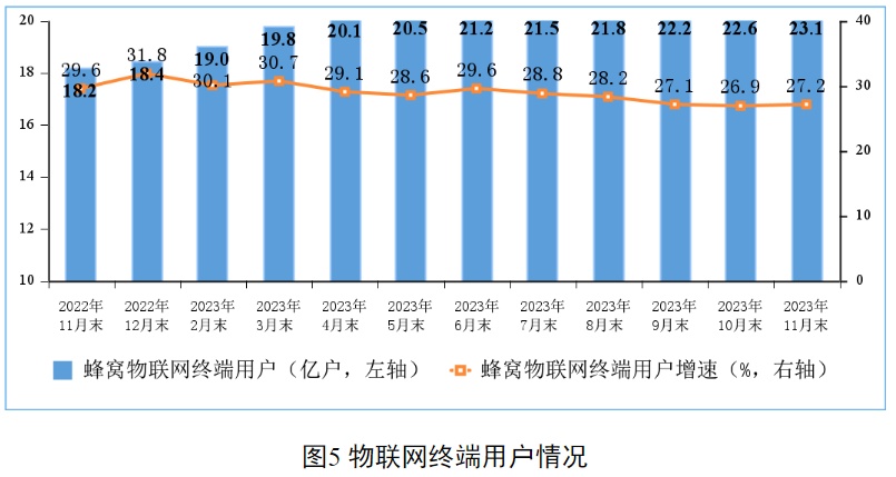 蜂窝物联网用户较快增长,IPTV(网络电视)用户稳步增加。截至11月末,三家基础电信企业发展蜂窝物联网终端用户23.12亿户,比上年末净增46772万户,占移动网终端连接数(包括移动电话用户和蜂窝物联网终端用户)的比重达57.3%。IPTV(网络电视)总用户数达3.99亿户,比上年末净增1878万户。
