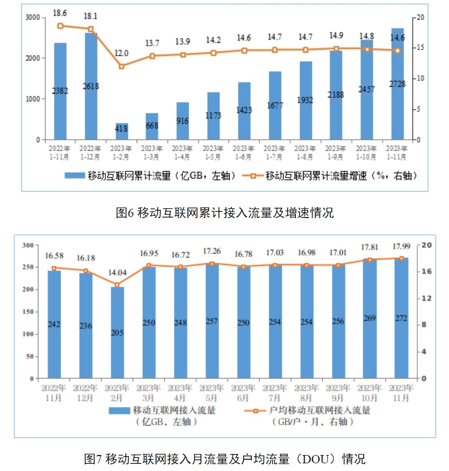 移动互联网流量较快增长,11月DOU值创年内新高。1—11月份,移动互联网累计流量达2728亿GB,同比增长14.6%。截至11月末,移动互联网用户数达15.1亿户,比上年末净增5611万户。11月当月户均移动互联网接入流量(DOU)达到17.99GB/户·月,同比增长8.5%,较上年12月份高1.81GB/户·月。