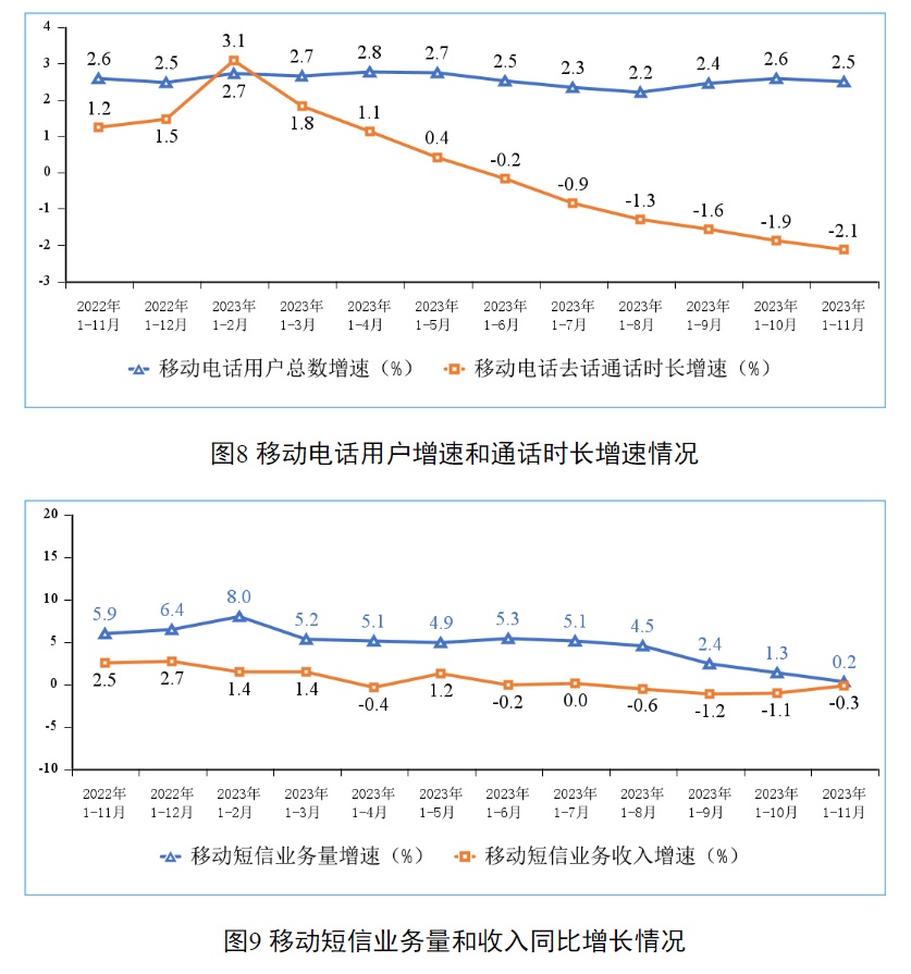 语音和短信业务持续收缩。1—11月份,移动电话去话通话时长完成2.06万亿分钟,同比下降2.1%;固定电话主叫通话时长完成736.4亿分钟,同比下降4.2%。1—11月份,全国移动短信业务量同比增长0.2%,增速较1—10月份回落1.1个百分点;移动短信业务收入同比下降0.3%,降幅较1—10月份收窄0.8个百分点。