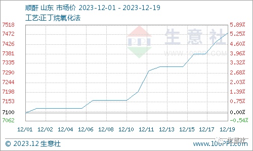 智通财经APP获悉,12月20日,据生意社商品行情分析系统,进入12月份国内顺酐行情持续上涨,截至12月19日正丁烷氧化法顺酐市场均价保持在7480元/吨,较12月1日价格7100元/吨上涨5.35%。其中,山东地区固酐出厂价7500元/吨左右,液酐出厂价7400元/吨左右。生意社表示,部分大厂意外停车,顺酐主力工厂价格调涨,经销商持续跟涨,加之顺酐上游加氢苯行情上涨,成本有一定支撑,下游不饱和树脂原料持仓有限,顺酐工厂发货紧张,执行前期订单为主,预计短期内顺酐市场或将继续上涨。