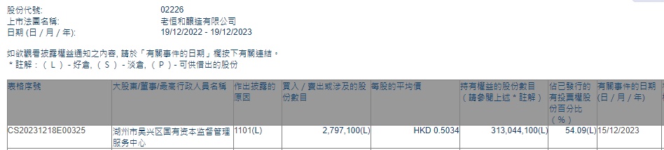 智通财经APP获悉,香港联交所最新资料显示,12月15日,湖州市吴兴区国有资本监督管理服务中心增持老恒和酿造(02226)279.71万股,每股作价0.5034港元,总金额约为140.81万港元。增持后最新持股数目约为3.13亿股,最新持股比例为54.09%。