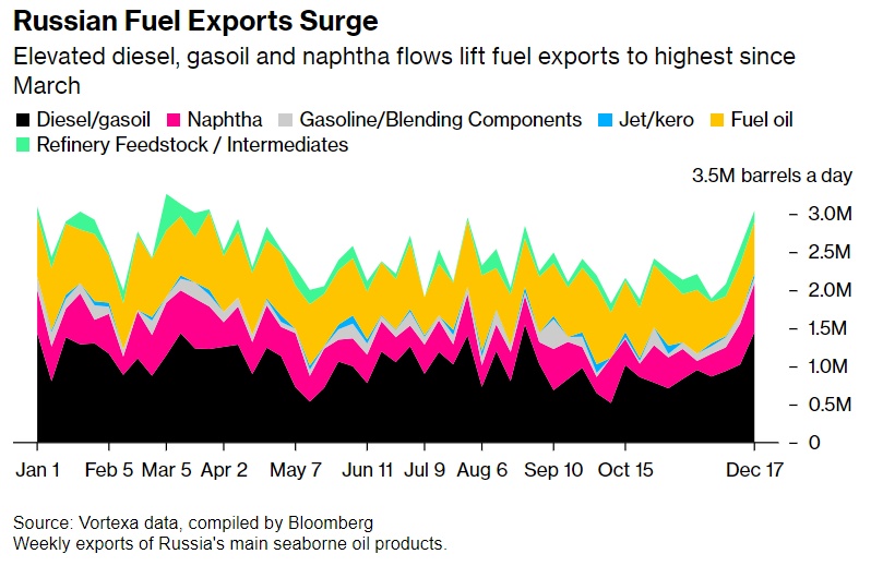 具体来看,在截至12月17日的一周,柴油和汽油出口较前一周飙升42%,至约140万桶/日,为去年8月底以来的最高水平。