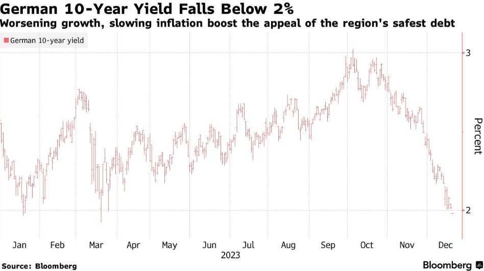自10月下旬以来,德国债券一直在上涨,因为疲软的欧元区经济数据和通胀放缓表明,政策制定者不需要将利率维持在高位太久。
