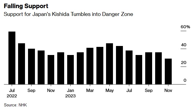 尽管日本首相岸田文雄重组内阁以应对政治资金丑闻,但民意调查显示其支持率继续下降。人们猜测,执政党自民党可能会考虑在岸田文雄明年9月任期结束前更换党领导人。摩根大通首席日本股票策略师Rie Nishihara表示,不稳定的政治环境“可能会给日本股市带来下行压力”。