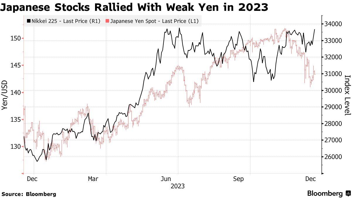 推动日本股市走高的日元疲软可能即将结束,这意味着股市将进入调整期。自11月触及年内低点以来,日元兑美元汇率已经上涨了约6%,这一转变是由于市场对日本央行将于明年结束负利率政策、而美联储和其他央行可能会降息的预期。