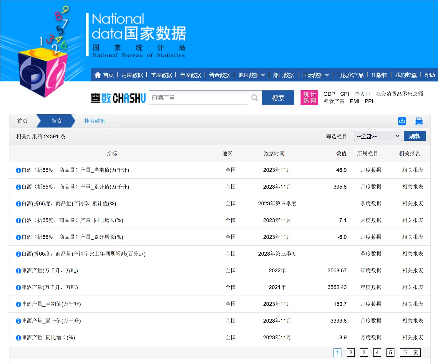 智通财经APP获悉,12月20日,据国家统计局官网,2023年1月至11月,白酒(折65度,商品量)产量累计值为395.8万千升,同比下降6.0%;其中11月白酒(折65度,商品量)产量为46.9万千升,同比增长7.1%。2023年1月至11月,啤酒产量累计值为3339.8万千升,同比增长1.6%;其中11月啤酒产量为159.7万千升,同比下降8.9%。