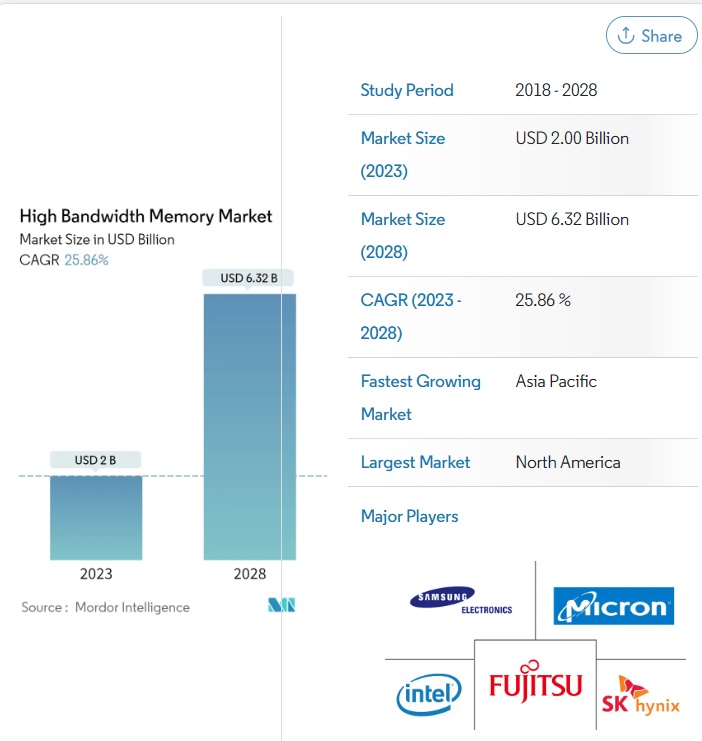 知名研究机构Mordor Intelligence预测数据显示,HBM存储产品的市场规模预计将从 2023 年的 20 亿美元增长到 2028 年的 63.2 亿美元,预测期内(2023-2028 年)复合年增长率为 25.86%。 Mordor Intelligence表示,推动HBM市场扩张的主要因素包括对高带宽、低功耗和高度可扩展存储器的需求不断增长、人工智能技术日益采用以及电子设备小型化趋势不断上升。