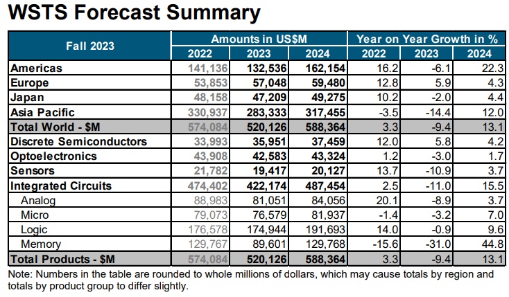 WSTS表示,展望2024年,全球半导体市场预计将达到5883亿美元,高于今年春季预测的5760亿美元,这一扩张预计将主要由覆盖PC、服务器以及智能手机等应用的存储领域所推动,预计到2024年将恢复至1200亿美元,与上一年相比增长超过40%;预计几乎所有关键类别,包括分立器件、传感器、模拟芯片、逻辑芯片和MCU等,预计都将呈现个位数增长。