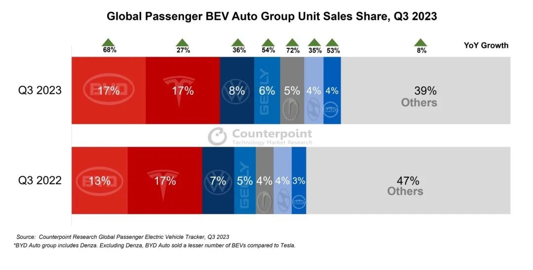 智通财经APP获悉,12月21日,Counterpoint全球乘用电动车车型销量追踪的最新研究显示,得益于欧洲和不断扩张的东南亚市场,2023年第三季度,全球乘用纯电动车(BEV)销量同比增长29%。第三季度,中国纯电动车销量仅增长11%,中国保持着全球最大纯电动车市场地位。中国品牌在海外成功销售了逾13万辆纯电动车,与2022年第三季度销量相比增长了四倍。特斯拉、比亚迪汽车和大众汽车是最畅销的纯电动车集团。比亚迪汽车(不包括腾势)销量已经赶上特斯拉,并预计将于第四季度超过特斯拉,斩获全球第一。