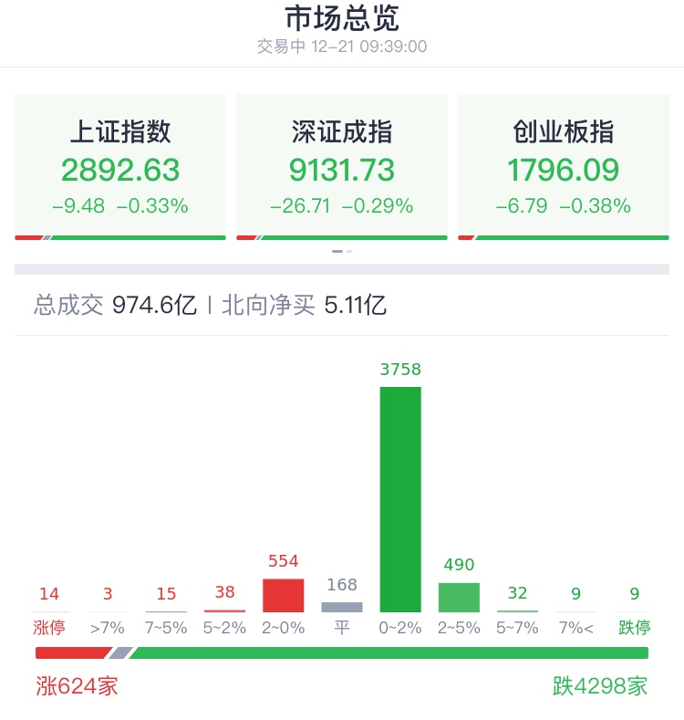 隔夜美股大幅收跌,三大股指均跌超1%,中概股指数下挫逾3%。12月21日,A股三大指数集体低开,沪指开盘跌破2900点关口,创业板指跌破1800点。截至发稿,沪指跌0.28%,深证成指跌0.17%,创业板指跌0.19%。