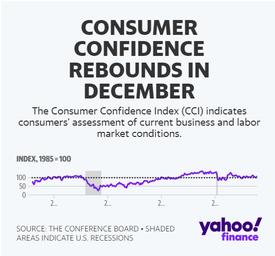 美国谘商会首席经济学家Dana Peterson表示:“12月消费者信心的增长反映了对当前商业状况和就业机会的积极评价,以及对未来六个月商业、劳动力市场和个人收入前景的悲观看法有所减少。”