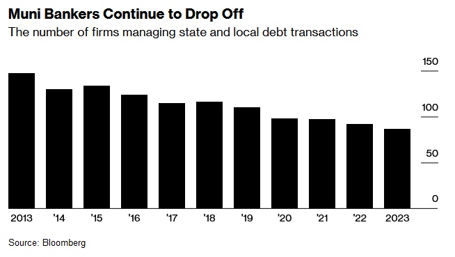 华尔街大型银行的退出对规模达4万亿美元的市政债券市场是一个很大的打击,因为承销商离开的情况可能会持续出现。数据显示,今年只有87家公司被认为是市政债券的承销商,比十年前下降了41%。承销商减少最终可能意味着美国市政当局在更换老旧道路、资助新建学校和扩大公共交通时的借贷成本将上升。