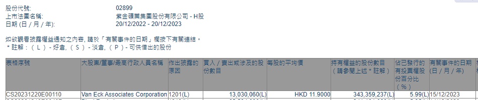智通财经APP获悉,香港联交所最新资料显示,12月15日,Van Eck Associates Corporation减持紫金矿业(02899)1303.006万股,每股作价11.9港元,总金额约为1.55亿港元。减持后最新持股数目约为3.43亿股,最新持股比例为5.99%。
