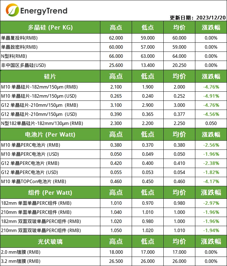 智通财经APP获悉,12月21日,TrendForce集邦咨询发文称,本周硅料价格暂时企稳,单晶复投料主流成交价格为60元/KG,单晶致密料的主流成交价格为59元/KG,N型料报价为64元/KG;组件价格企稳,本月组件交易惨淡,价格中枢再次下移,182P型单面跌穿1元线,厂商亏损进一步拉大,仍需静待明年Q1回暖信号。此外,本周硅片价格分化,预计短期内,供需两端的支撑,将稳定N型硅片的走势;电池片价格分化,M10价格下行,其余型号暂稳。