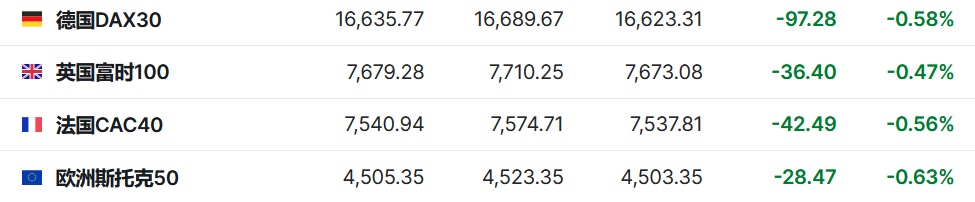 2.截至发稿,德国DAX指数跌0.58%,英国富时100指数跌0.47%,法国CAC40指数跌0.56%,欧洲斯托克50指数跌0.63%。