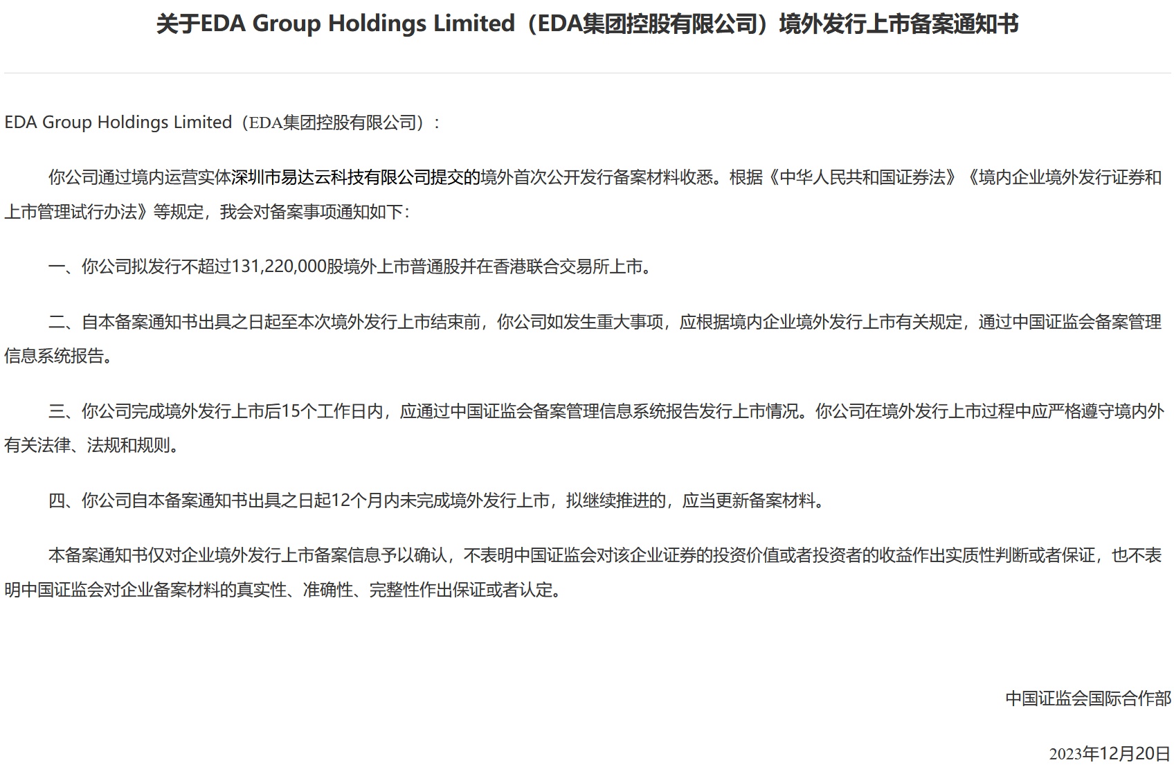 智通财经APP获悉,12月21日,中国证监会发布关于EDA Group Holdings Limited(EDA集团控股有限公司)境外发行上市备案通知书,公司通过境内运营实体深圳市易达云科技有限公司提交的境外首次公开发行备案材料收悉。公司拟发行不超过131,220,000股境外上市普通股并在香港联合交易所上市。