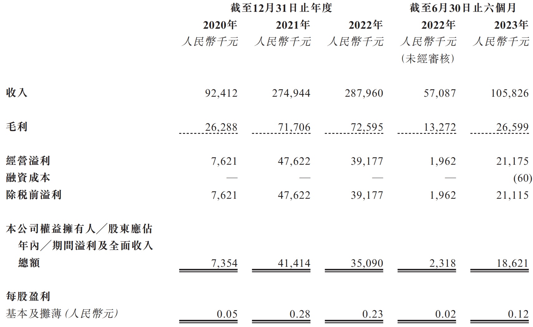 财务方面,于2020年、2021年、2022年以及2023年6月30日止,公司收益分别为9241.2万元、2.75亿元、2.88亿元、1.06亿元人民币,同期,公司实现期内溢利分别为735.4万元、4141.4万元、3509万元、1862.1万元人民币。