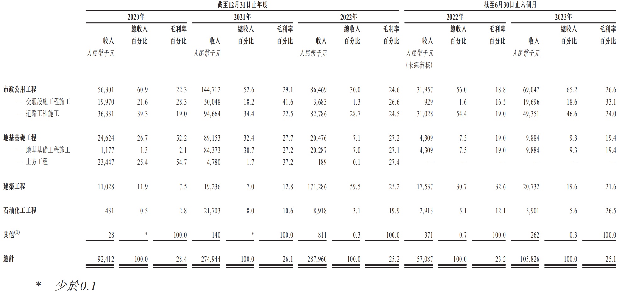 于往绩记录期间,天津建发主要致力于工程施工业务,包括(i)市政公用工程,主要包括道路工程及交通设施工程;(ii)地基基础工程,主要包括地基基础建设工程及土方工程;(iii)建筑工程;及(iv)石油化工工程附注(于往绩记录期间公司主要承接加油站升级及改造、管道安装以及油罐大修项目)。下表载列于所示期间按工程施工服务类型划分的收入明细: