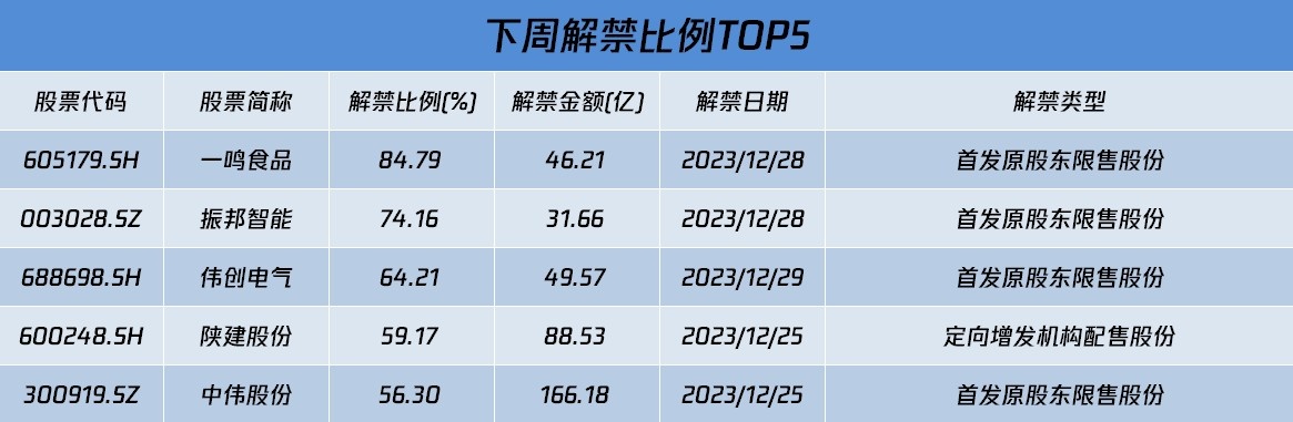 从解禁比例来看,下周一鸣食品解禁比例达84.79%,其次解禁比例居前的分别为振邦智能、南山智尚。