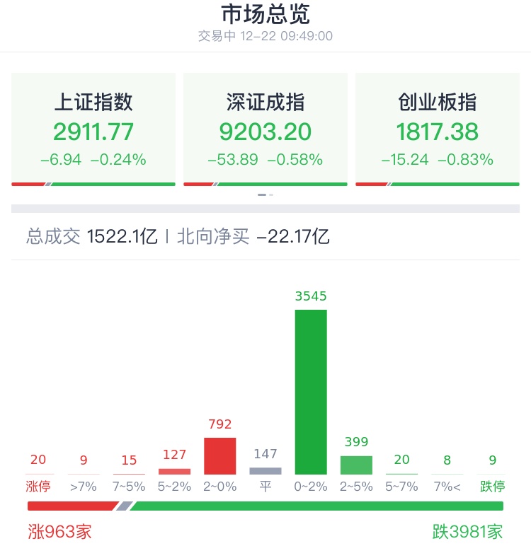 12月22日,近八成私募看多明年A股行情,多家银行今日起下调存款利率。A股三大指数开盘涨跌不一,截至发稿,沪指跌0.23%,深证成指跌0.6%,创业板指跌0.85%。