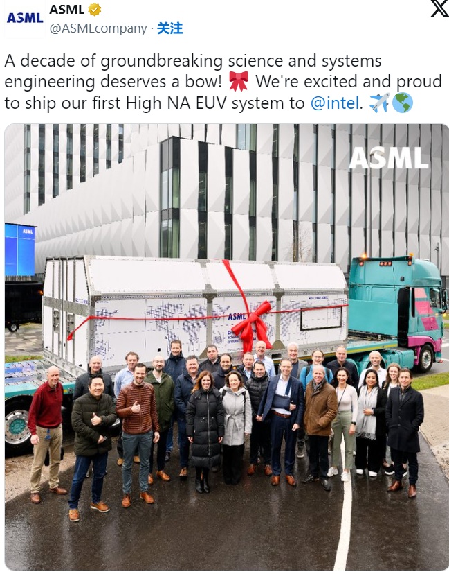 阿斯麦发言人虽然未回复相关消息,但阿斯麦当地时间周四在社交媒体X(前推特)上发表的一篇文章中表示:“我们很兴奋,也很自豪能向英特尔交付我们的首个high-NA EUV系统。”