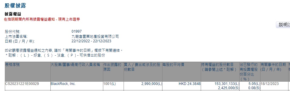智通财经APP获悉,香港联交所最新资料显示,12月18日,贝莱德增持九龙仓置业(01997)299万股,每股作价24.3848港元,总金额约为7291.06万港元。增持后最新持股数目约为1.53亿股,最新持股比例为5.05%。