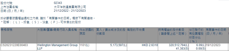 LLP增持太平洋航运(02343)517.3597万股,每股作价2.6310港元,总金额约为1361.17万港元。增持后最新持股数目约为3.21亿股,最新持股比例为6.09%。