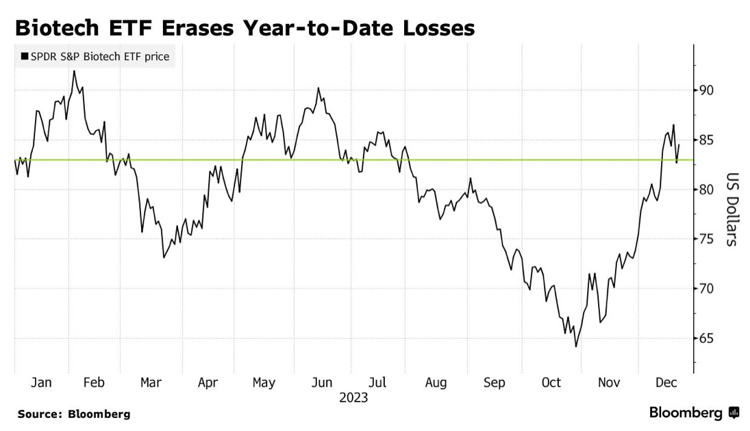 一些人认为医疗器械类股和生物科技股有进一步回升的空间。Baird医疗保健专家Mike Perrone说:“这两个细分行业最有可能从目前的低迷水平改善。如果经济放缓,他们希望加强防御,而医疗保健是一个很好的防御部门。”几十年来最高的利率和一系列糟糕的临床试验数据已经压垮了高风险、高回报的生物技术公司,使得一些该行业的一些风险得以出清。上周,美联储暗示明年多次降息,抹去了备受关注的SPDR SP生物技术ETF今年以来的跌幅。过去两年,这只等权重ETF的年跌幅超过20%。
