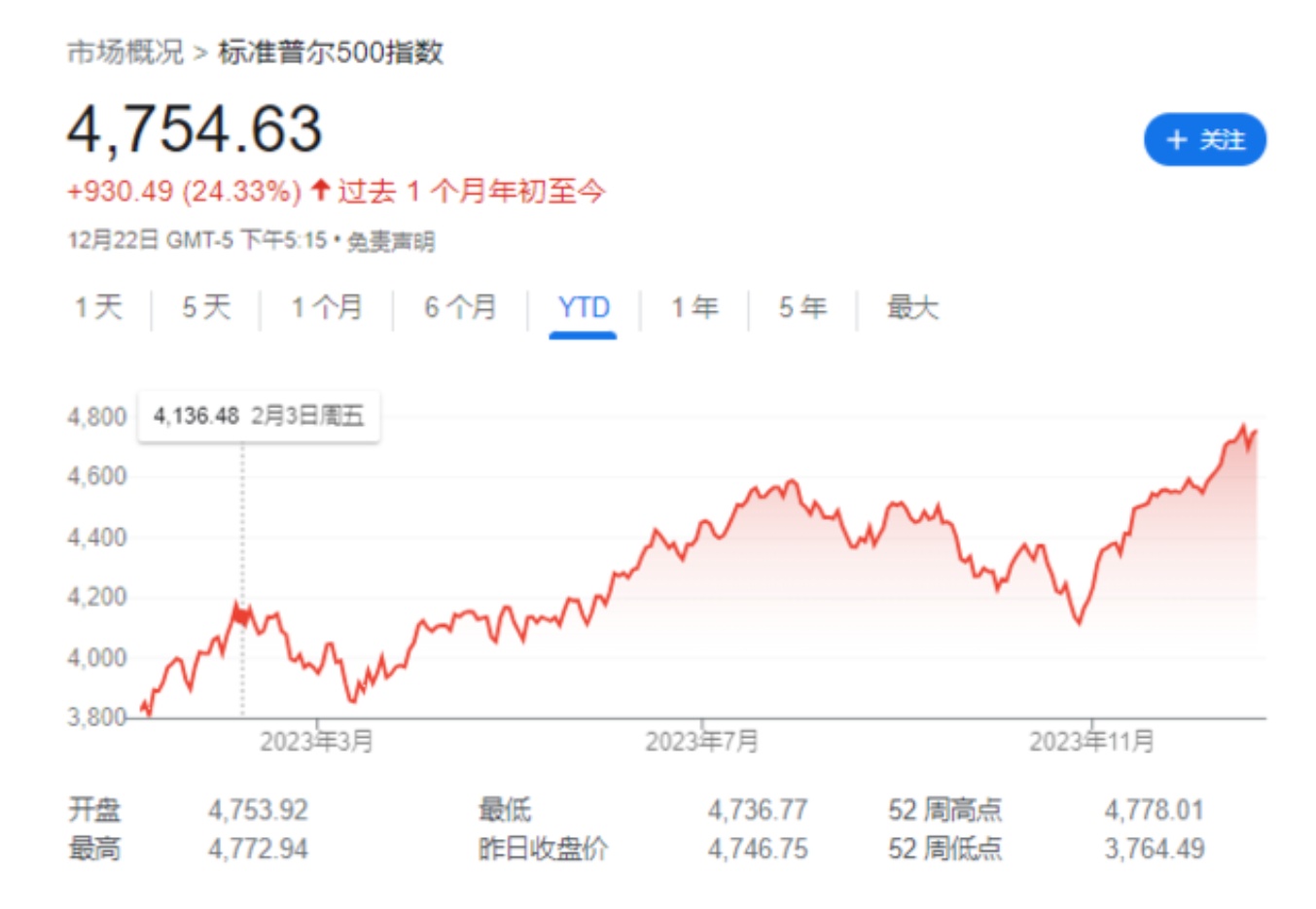 年初,不少策略师预计,2023年市场回报率平平。然而,随着经济稳健增长和通胀的放缓,2023年美股表现稳步攀升。特别是在美联储主席鲍威尔暗示明年利率可能下调,美联储明年降息预期的支撑下,市场更是一路高歌。