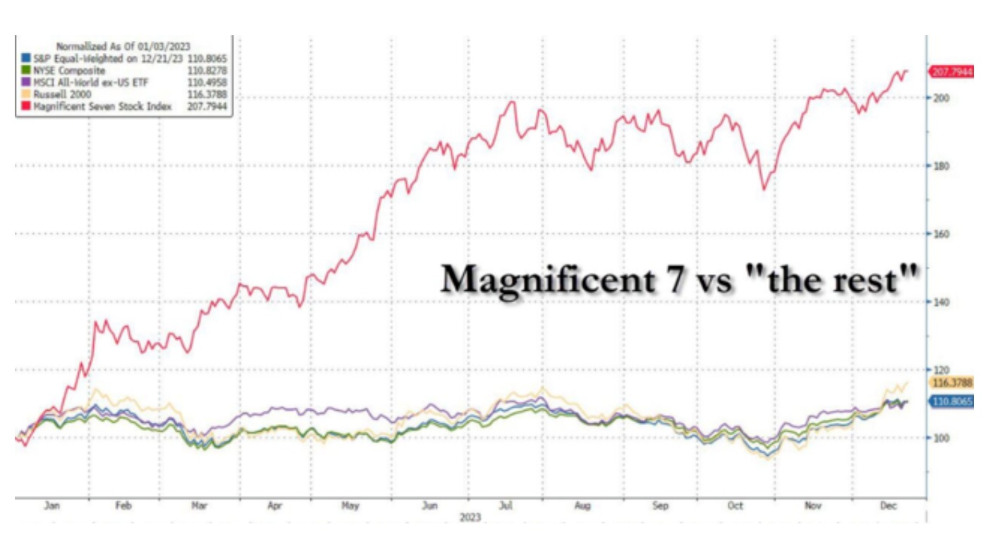 数据显示,今年标普500的涨幅主要由科技“七巨头”——苹果、微软、谷歌、亚马逊、Meta以及最新进入这一团体的英伟达和特斯拉推动。