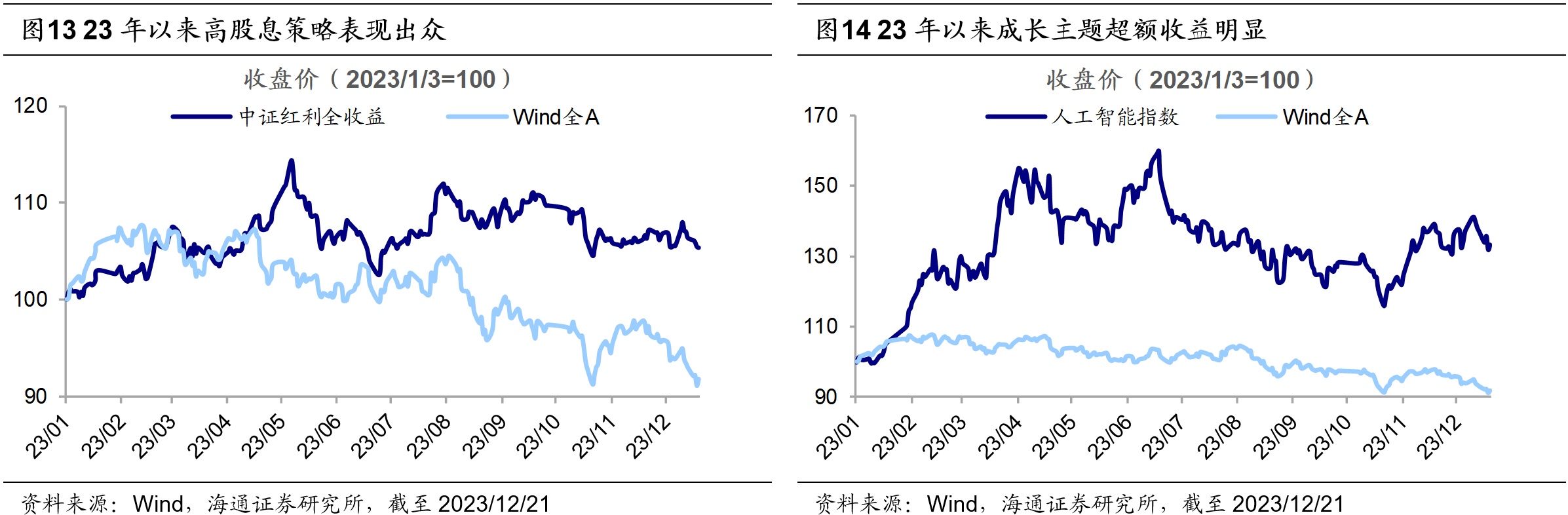 部分投资者预期24年或延续弱复苏与存量资金博弈,哑铃型行情或将继续。回顾今年以来市场风格特征,可以发现有别于近些年盛行的赛道龙头、白马成长行情,今年市场行情呈两头占优的哑铃型表现,市场风格的切换引发了市场较大的关注。回顾2023年以来的A股结构,风格上呈现“高股息+科技成长”两头占优的哑铃型表现,年初至今(截至23/12/21)中证红利全收益指数涨幅为6.0%,人工智能指数为38.6%,明显高于同期万得全A涨跌幅的-7.1%。实际上,2023年高股息策略和科技主题型投资占优,背后反映的是经济曲折修复、资金存量博弈的格局。而目前来看,部分投资者预期明年宏微观基本面复苏之路可能仍然波折,此外内外资增量资金乏力的问题较难出现明显改善。目前外资仍在延续流出态势,截至23/12/22,8月以来至今最大净流出额已达2102亿元,北上资金全年累计净流入额仅250亿元,为2014年陆股通开通以来的次低值;另一方面公募发行仍较低迷,截至23/12/21,今年偏股型基金发行规模为3024亿元,为2015年以来的最低值。若明年经济延续弱复苏、资金存量博弈的背景不变,市场结构或将延续两头占优的哑铃型格局。