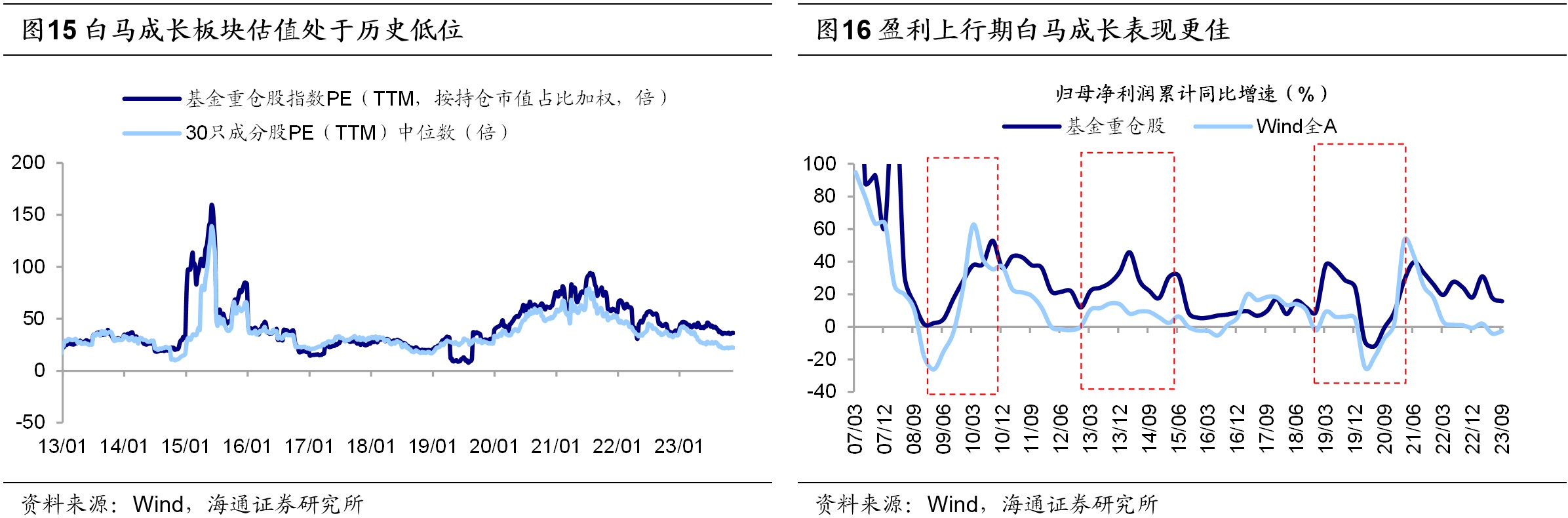 24年基本面回升是支撑白马成长修复的动力。我们从逆向思考,市场风格出现反转的动力在哪里?我们在《破晓——2024年A股展望-20231208》中提出,随着稳增长政策持续发力,叠加库存周期进入补库阶段,明年国内经济运行有望进一步好转,A股盈利将持续复苏,白马成长板块已逐渐具备投资性价比。当前以基金重仓股为代表的白马成长组合估值已处于历史中低水平,借鉴历史白马成长板块在A股盈利上行周期内业绩表现更优,因此24年业绩上行期白马成长有望在业绩表现上更为占优,市场风格或有望从高股息+科技成长的“两头”占优逐渐向白马成长靠拢。